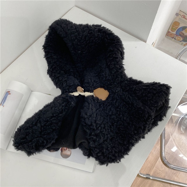 Artificial lamb hair Cashmere Hooded Neck Collar Cap Head Drawstring Thick Beanie Winter Warm Solid Color Adjustable Elastic Hat