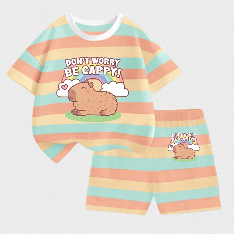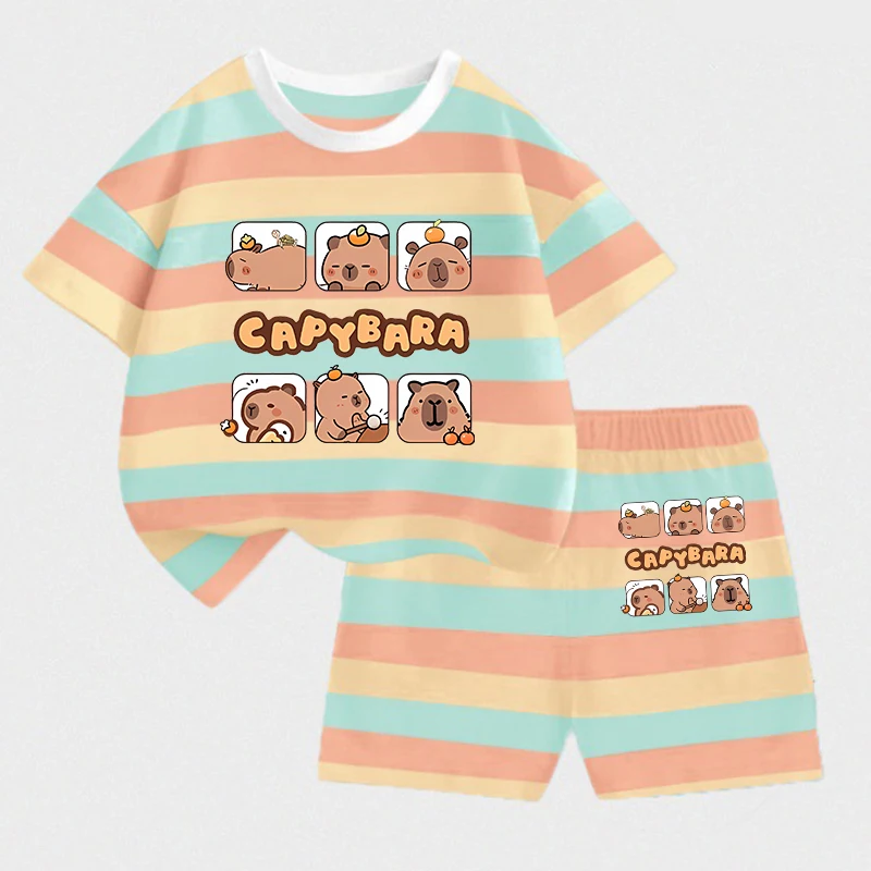 Capybara Baby Stripe T-Shirt Pants Suit Boys Girls Clothes Cartoon Figures Outfit Tracksuit Printed Tees Kids Pajamas Set