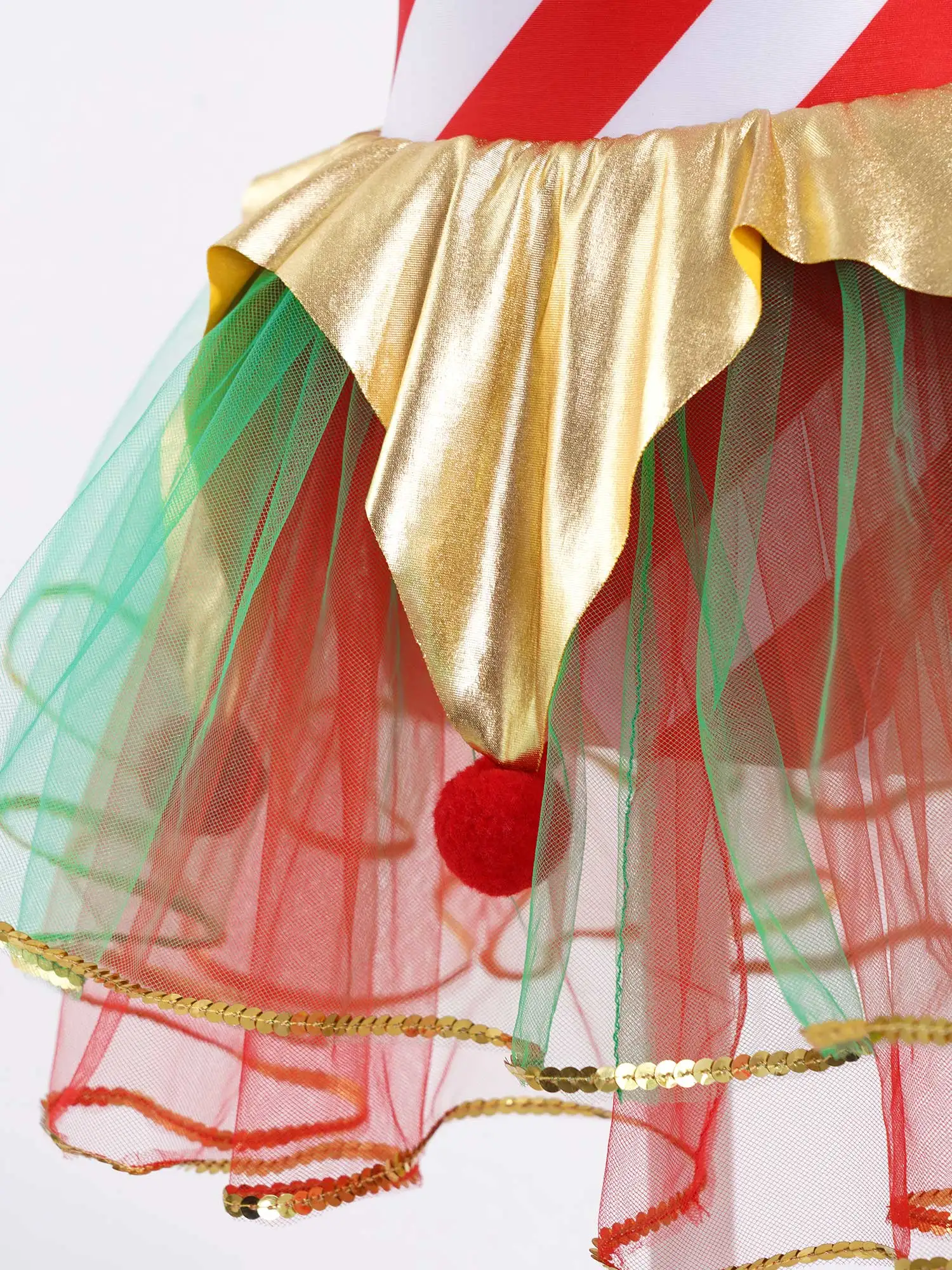 Kids Girls Asymmetrical Shoulder Sleeveless Stripes Print Sequins Mesh Dress Bodysuit.
