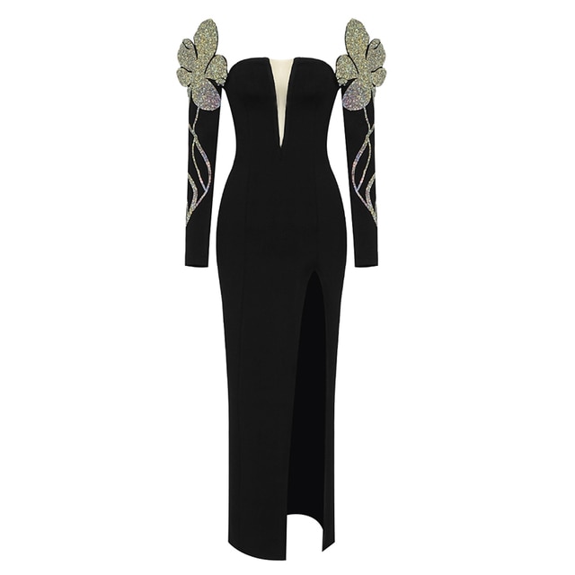 VC Trendy Beads Appliques Design Bandage Long Dress Women Sexy Off Shoulder Celebrity Party Club Vestido